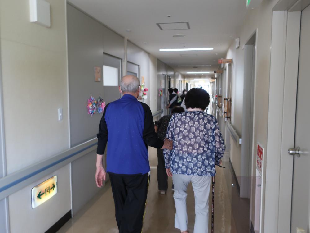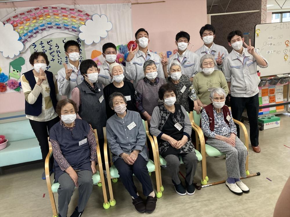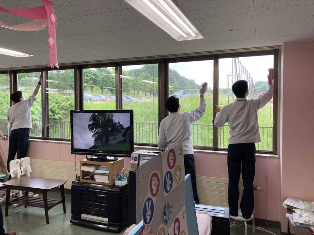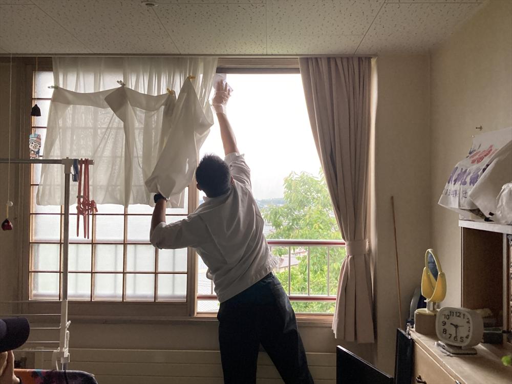 利用者様の居室の窓清掃をお願いし、その後、デイサービス利用者と交流して頂きました。